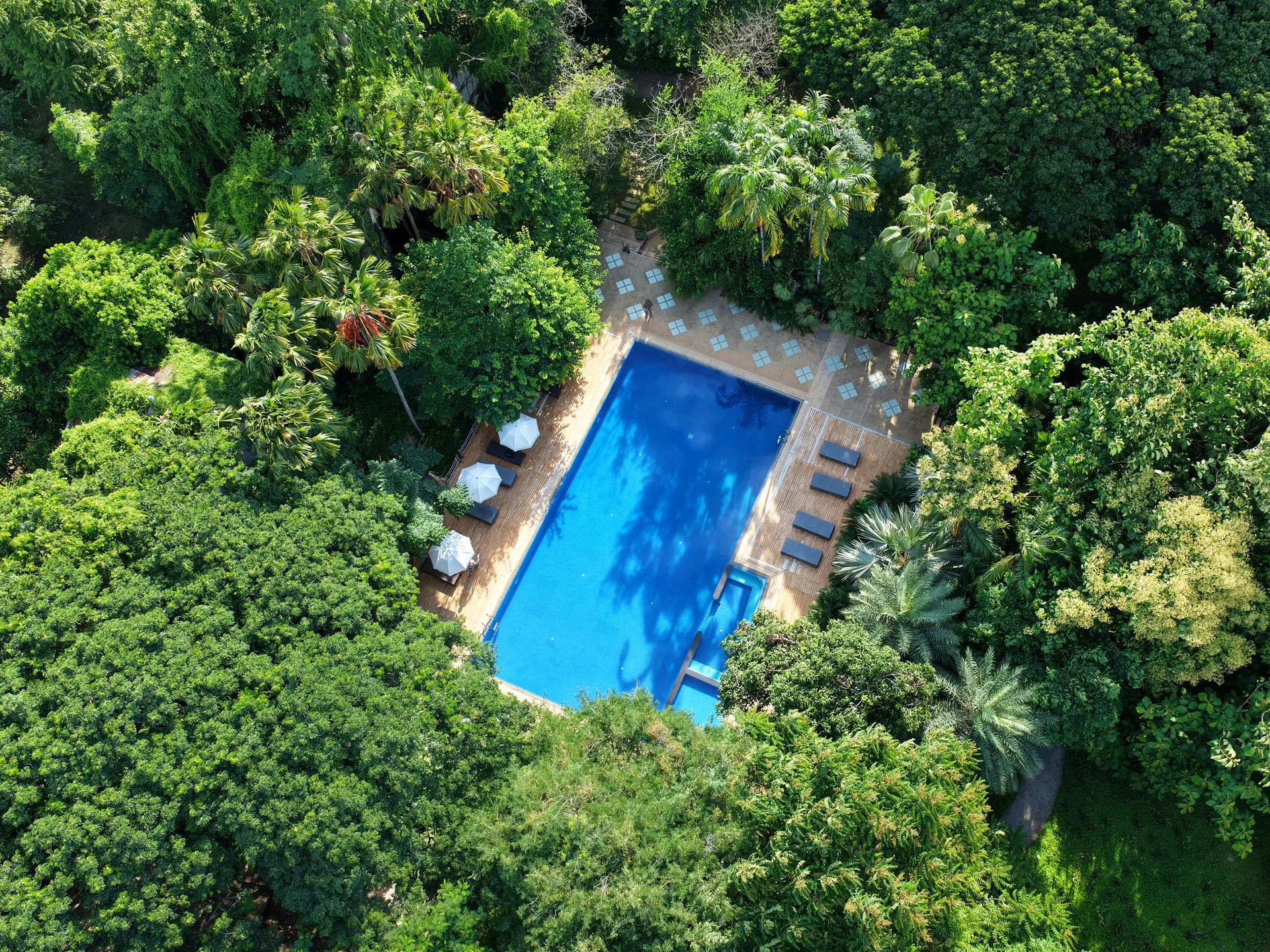 A swimming pool set within a tropical landscape