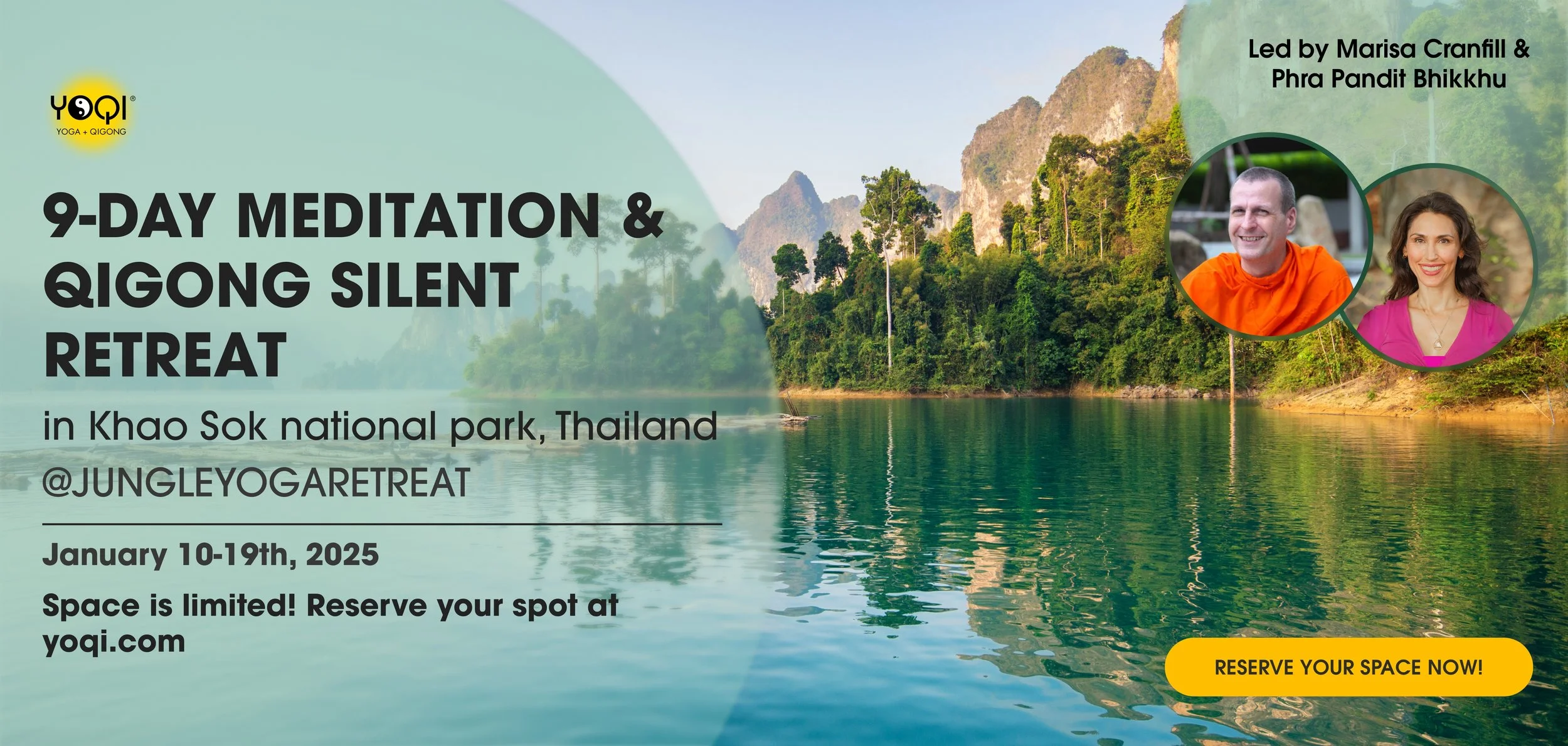 If you have dreamed to do a silent meditation retreat deep in the jungle, with a Buddhist monk, guided Qigong sessions, delicious food, massage, kayak meditation and daily swims in a pristine lake, this is the retreat for you! Join Marisa Cranfill and Venerable Pandit Bhikkhu for a nine-day Sammatha-Vipassana meditation retreat at Jungle Yoga in Khao Sok National Park. This retreat focuses on silent mindful meditation practice and is supported by Qigong, Yin Yoga and Dhamma talks. We have rented the whole resort for our own private usage. During these nine days, you will learn the fundamentals of the Buddha’s teaching along with discussions of complimentary Qigong meditation principles and practices. This silent retreat is for those who are serious to go deep within and practices can be adjusted for all levels and body types.