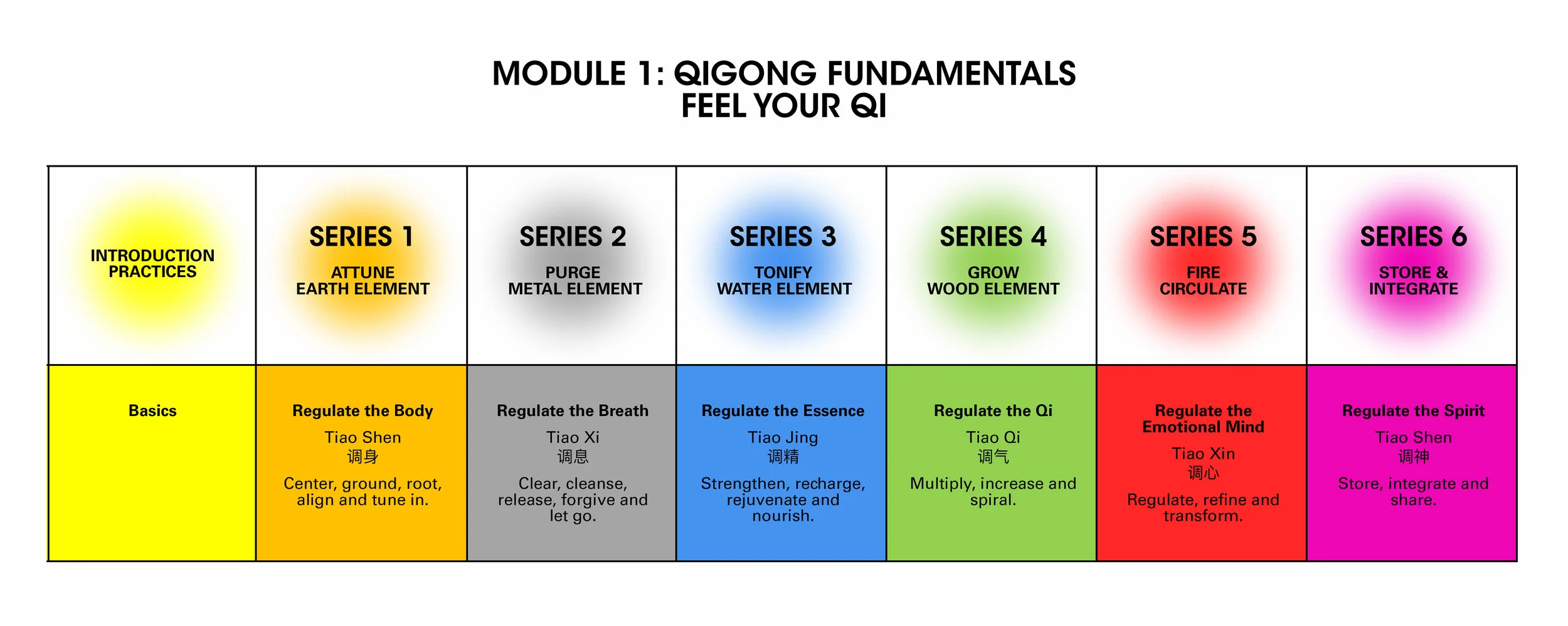 The Online Course is divided into 2 parts. Part 1 is the Introduction Series. Part 2 is the Six Phases of Qigong Flow: Attune, Purge, Tonify, Grow, Circulate, and Store. The Module 1 program is meant to be practiced in order, beginning with the Introduction Series.